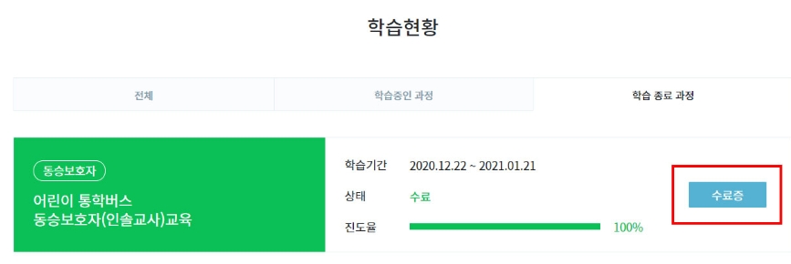 2) 학습을 종료한 과정의 목록에서 '수료증'을 클릭하여 해당 과정의 수료증을 출력합니다. 수료증은 PDF 파일 형태로 저장이 가능합니다.