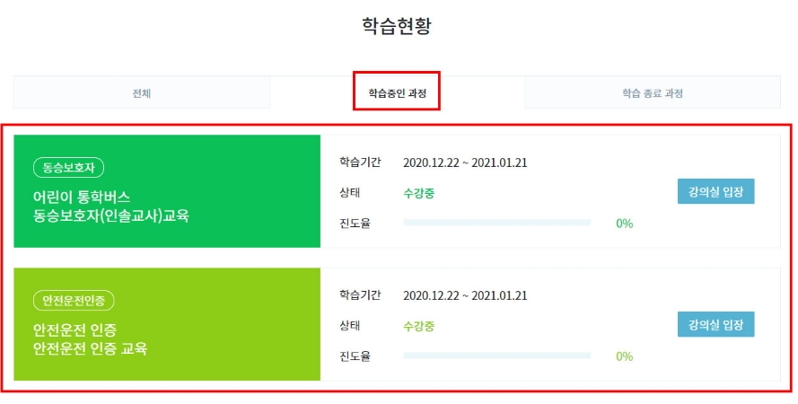 2) '나의 강의실 > 학습현황 > 학습중인 과정'의 목록에서 학습할 과정의 '강의실 입장'을 클릭하면 해당 교육과정의 강의실로 이동하게 됩니다.