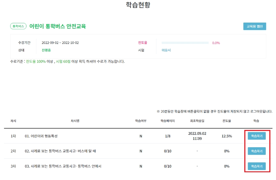 3) 강의실에서 '학습하기'를 클릭하면 해당 교육과정의 학습을 진행하실 수 있습니다.