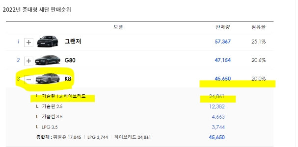 K8하이브리드 가격 및 제원에 대해서 알아보겠습니다. K8은 기아의 준대형 세단으로 현대 그랜져와 동급인 차량입니다. K8 판매량을 보면 총 45,650대이며 그 중에서도 유독 하이브리드가 24,861대로 절반 이상이 판매되고 있는 상황입니다.