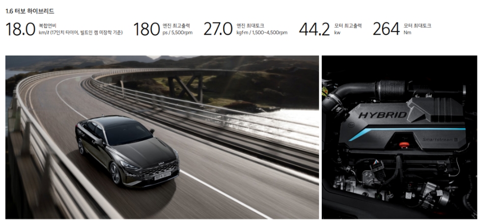 하이브리드는 최대 180마력의 파워를 지녔으며 모터 최고 출력은 44.2kw로서 복합연비 18키로로 준대형차량이지만 굉장히 좋은 연비를 가지고 있습니다.