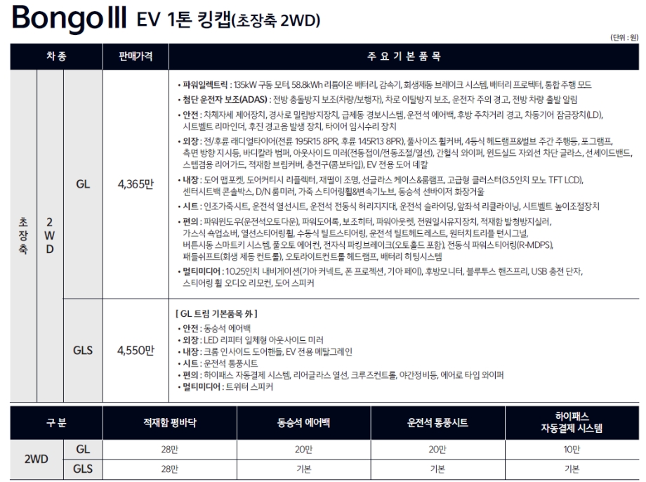봉고3 전기차 가격은 GL 4365만원, GLS 4550만원 이되겠으며 자세한건 아래에서 확인하겠습니다.