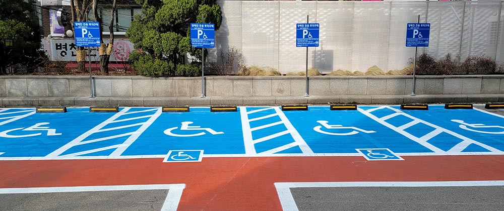 장애인 주차구역은 주차구역 밑에 휠체어를 타고 있는 사람모양의 모습이 그려져 있습니다. 주차구역에 저 모양이 있는 경우에는 장애인만 주차할 수 있으며 장애인을 위해서 항상 비워둬야 합니다.