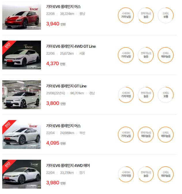 EV6 중고차 가격은 2023년식 4,249 ~ 5,876만 원, 2022년식 3,657 ~ 5,029만 원, 2021년식 3,035 ~ 4,292만 원입니다. 차량별로 연식이 다르니, 아래 연식과 중고차 매물을 참고해 주세요.