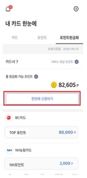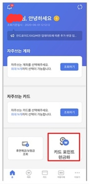 어카운트인포 앱에서 현금화 가능한 카드포인트를 일괄 조회하고 현금화 신청한 포인트를 본인명의 계좌로 이체할 수 있는 서비스입니다.