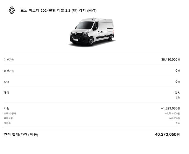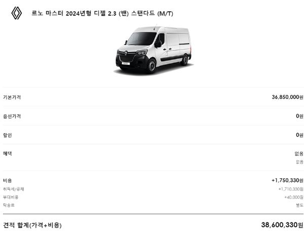 정리해보면 2024년 르노마스터의 신차가격은 3685~3845만원으로 실구매가는 세금 180만원 가량이 추가되어 3860~4000만원 가량이 됩니다.