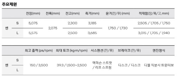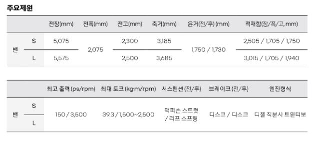 | 외관 | 16" 스틸휠, 휠커버 & 225/65R 16 타이어(콘티넨탈), 크롬 라디에이터 그릴, C자형 주간주행등, 리어 콤비네이션 램프, 후방 안개등, 방향지시등 일체형 아웃사이드 미러, 그립타입 아웃사이드 도어핸들, 우측 슬라이딩 도어, 리어 트윈 스윙 도어(밴 S: 180°, 밴 L: 270°), 앞/뒷바퀴 머드 가드 |