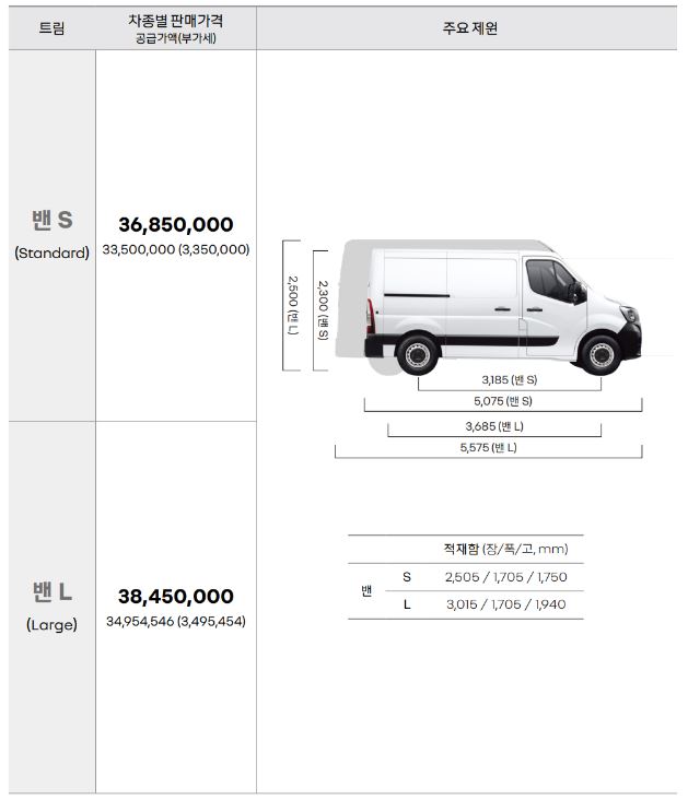 아래는 2024년형 르노 마스터의 신차 가격표입니다. 2024 르노 마스터 가격은 밴 스탠다드 3,685만 원, 밴 라지 3,845만 원입니다.