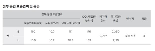 | 안전 | 운전석 에어백, 차체자세 제어장치(ESC), 경사로 밀림방지장치(HSA), 타이어 공기압 자동감지 시스템(TPMS), 차선 이탈 경보 시스템(LDW), 측풍영향 보정 기능, 익스텐디드 그립 컨트롤, 와이드 뷰 미러(동승석 사각지대 미러), 트레일러 흔들림 보정 기능, EBD-ABS (BAS 내장), 4륜 디스크 브레이크, 차속감응 오토도어록, 앞좌석 3점식 시트벨트(리마인드경고기능, 운전석 프리텐셔너/로드리미터/높이 조절장치 포함) |