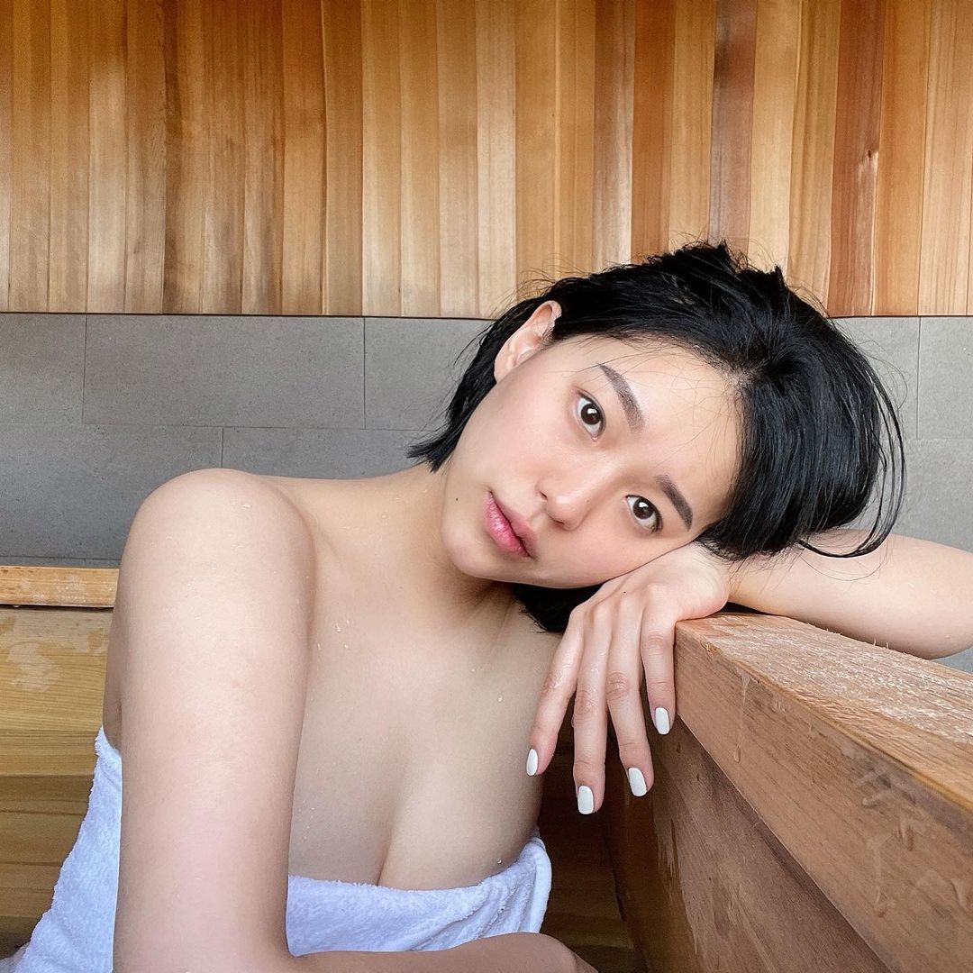 히노끼탕에서 찍은 사진은 뒷모습만 봐도 아름다운 몸매를 보여주고 있는데 앞에서 본 사진은 청순가련한 외모로 아름다움의 극을 보여주고 있다. 여신이라고 해도 믿을만한 외모이다.