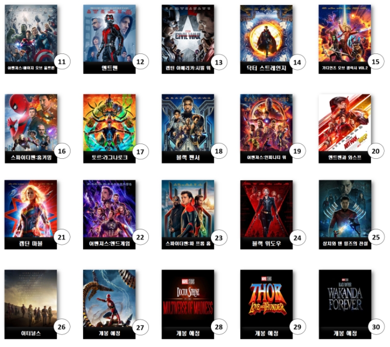 아이언맨 -> 인크레더블 헐크 -> 아이언맨2 -> 토르:천둥의신 -> 캡틴 아메리카:퍼스트 어벤져 -> 아이언맨3 -> 토르:다크월드 -> 틴 아메리카:윈터 솔져 -> 가디언즈 오브 갤럭시 -> 어벤져스:에이지 오브 울트론 -> 엔트맨 -> 캡틴 아메리카:시빌 워 -> 닥터 스트레인지 -> 가디언즈 오브 갤럭시 -> 스파이더맨:홈커밍 -> 토르:라그나로크 -> 블랙 팬서 -> 어벤져스:인피니티 워 -> 앤트맨과 와스프 -> 캡틴마블 -> 어벤져스:앤드게임 -> 스파이더맨:파 프톰 홈 -> 블랙위도우 -> 걍치와 텐 링즈의 전설 -> 이터널스