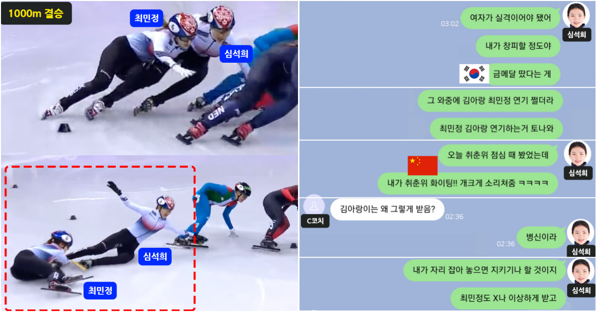 그리고 실제 여자 쇼트트랙 1000m 결승전 경기에서도 아웃코스에서 진입하던 최민정을 심석희가 팔로 밀어버리고 이 과정에서 넘어지는 최민정에 심석희도 뒤엉켜 같이 넘어진 것으로 볼 수도 있는 장면이 연출되어"단순 사고가 아닌 고의가 아니냐"는 의심과 비판을 받고 있습니다. 이후 디스패치는 심석희와 조항민에게 연락을 취했지만, 답변을 들을 수 없었다고 합니다.